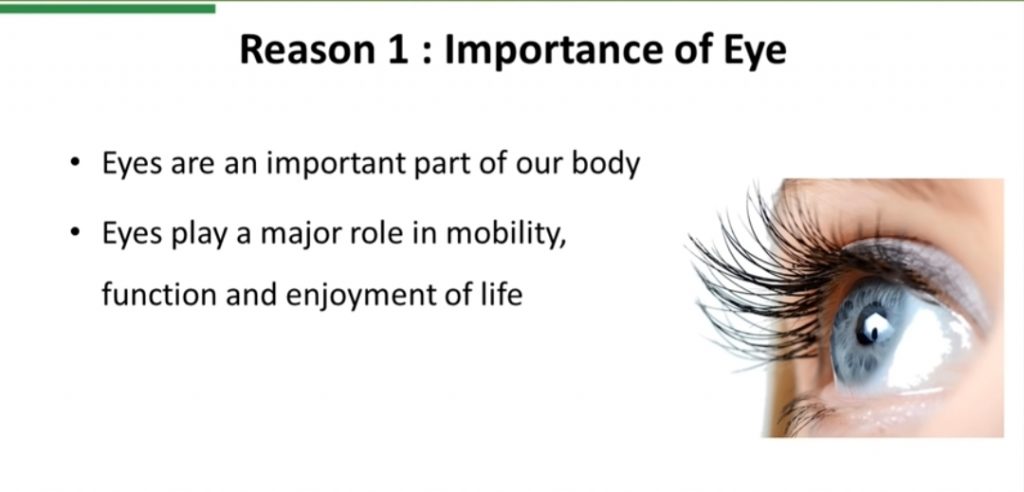 Very important because it connects us with the environment around us and helps our brain to work at a faster pace. It makes us aware of new things and creates memories, so with problems in our eyes we cannot even imagine life, but our eyes grow old with time and lose their clarity,